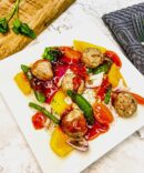 Sweet and sour meatballs over rice with veggies & a bun.